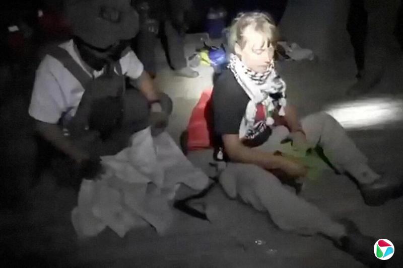 以色列外交部周三发布的视频截图显示,今年22岁的瑞典青年活动家通贝里(右)坐在一名身穿战术装备的人旁边。(路透社)