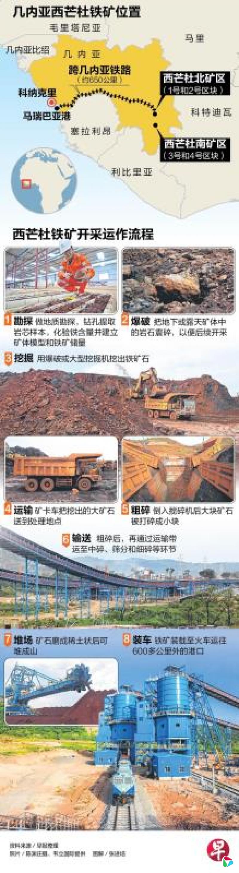 除了总面积约700平方公里的南北矿区,长约650公里的跨几内亚重载铁路和靠近几内亚首都科纳克里的港口马瑞巴亚(Morebaya)也是项目重要组成部分。项目产能最终可达每年1亿2000万公吨,南北矿区各占一半,可占全球铁矿贸易总需的约5%。