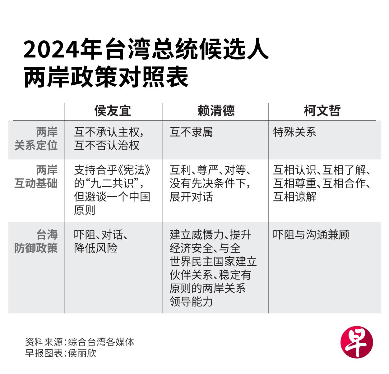相对于赖清德的“民主与专制的选择”之说,国民党总统候选人侯友宜则形容,这场选举是“战争与和平的选择”。他强调两岸和平是经济发展的根本,当选后将会重新协商《海峡两岸经济合作架构协议》(ECFA),包括服务、货物贸易协议,确保台商投资权益,也会开放大量陆生到台湾就业。
