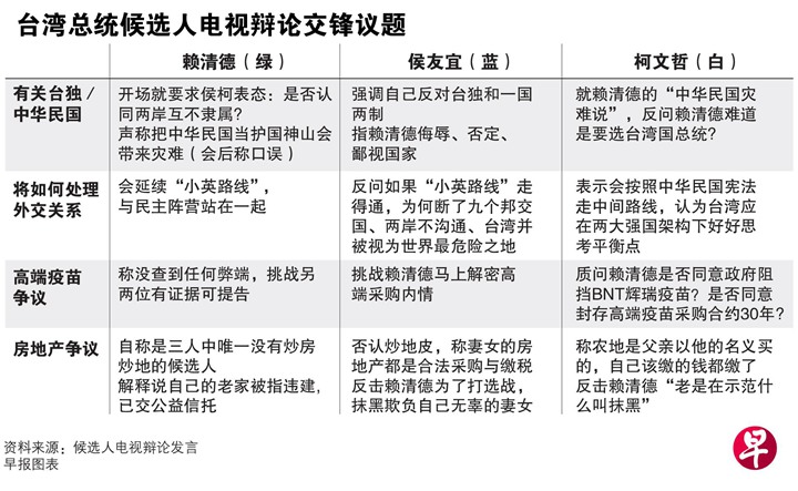 台湾候选人电视辩论会星期六(12月30日)登场,绿营民进党的赖清德、蓝营国民党的侯友宜,与白营民众党的柯文哲正面对决,针对两岸关系、疫苗采购合约和房地产争议激烈交锋。