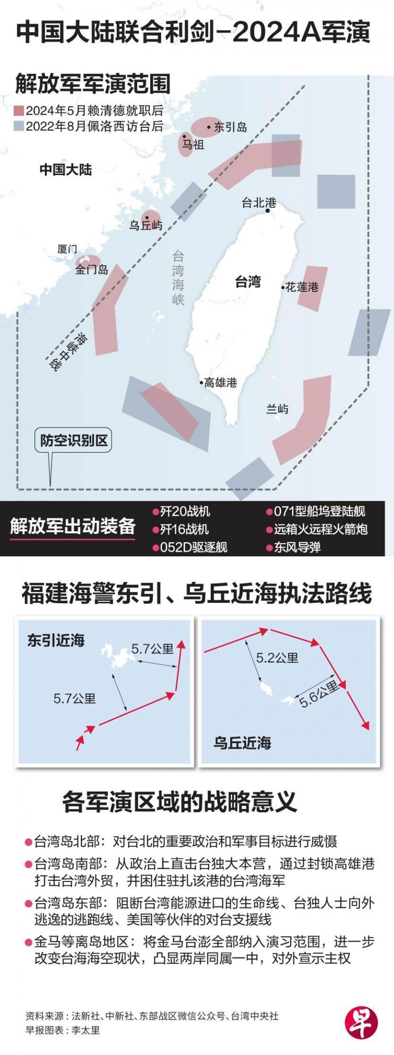 根据解放军东部战区在微信公众号发布的演习示意图,这次军演以五大区域全面包围台湾本岛,以及澎湖、兰屿、金门、马祖,乃至乌丘屿、东引岛等外岛。