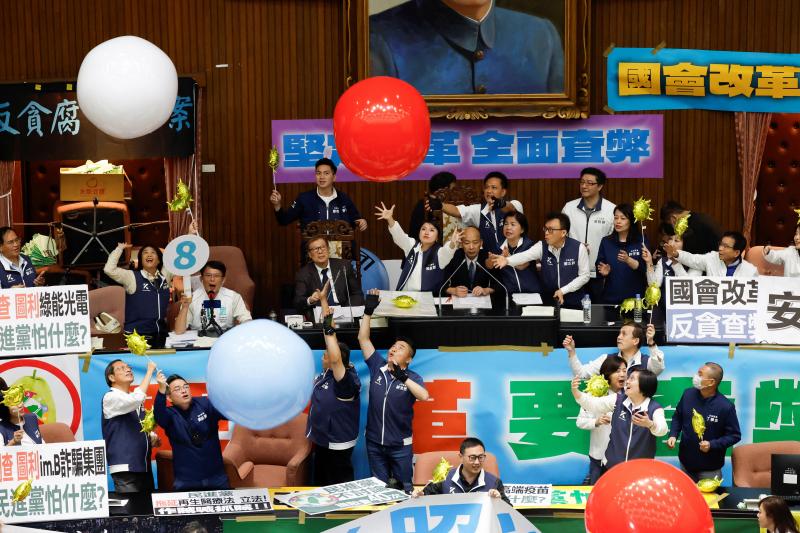 台湾立法院星期二(5月28日)续审蓝白两党所提立法院职权相关修法的途中,多颗气球在议场内漂浮。(路透社)