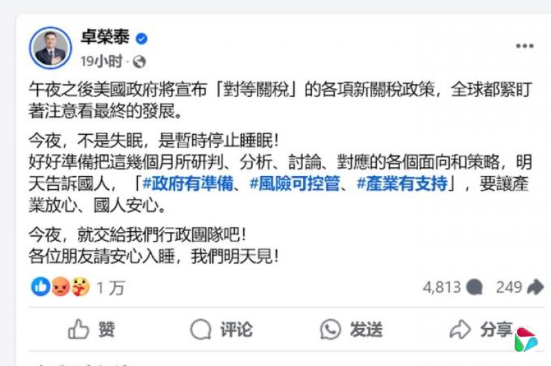 此前一天,卓荣泰曾在脸书发文大派定心丸,强调要让产业放心、人民安心。他写道:“午夜之后美国政府将宣布对等关税的各项新关税政策……好好准备把这几个月所研判、分析、讨论、对应的各个面向和策略,明天告诉国人,‘#政府有准备、#风险可控管、#产业有支持’。”