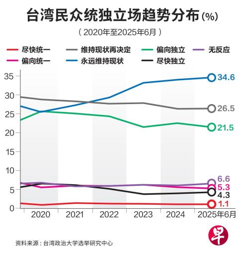 统独立场方面,自俄乌战争爆发的2022年起,“永远维持现状”成为这项民调中比率最高的选项。最新调查则显示,有34.6%的台湾民众选择永远维持现状、26.5%选择维持现状后再决定。若将这两项加总起来,显示61.1%的台湾民众在统独立场上选择“维持现状”,是显著的主流民意。