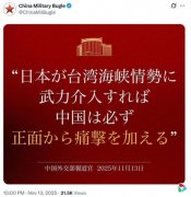 中国大陆军方星期四(11月13日)在社交平台引用外交部针对日本首相高市早苗涉台言论的回应,用日文警告日本若胆敢武力介入台海局势,中方必将迎头痛击。