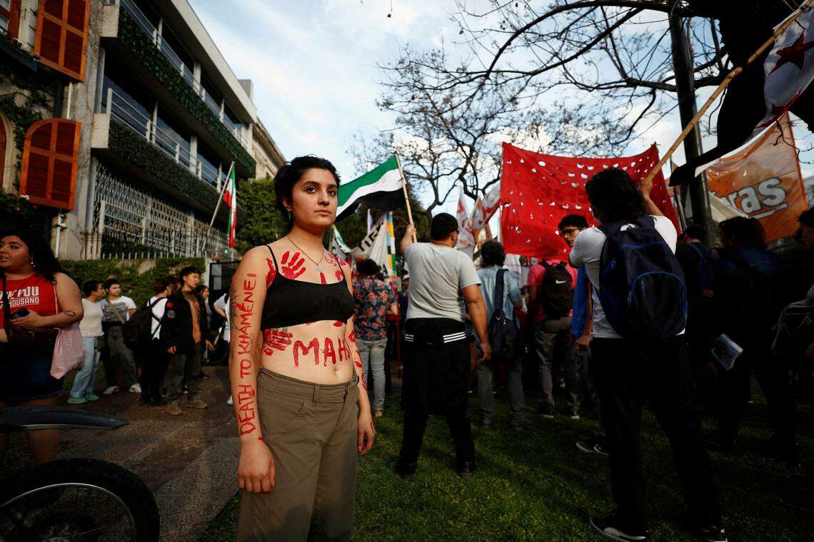 9月27日,一名抗议者在阿根廷参加阿米尼抗疫活动时,用红色颜料在身上画上代表“触摸”的手掌和抗议字眼。(路透社)