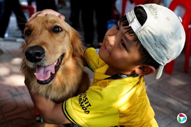 4月1日,泰国曼谷大楼倒塌事故的搜救行动仍在继续,一名儿童拥抱着泰国K9 USAR的一条搜救犬。(路透社)
