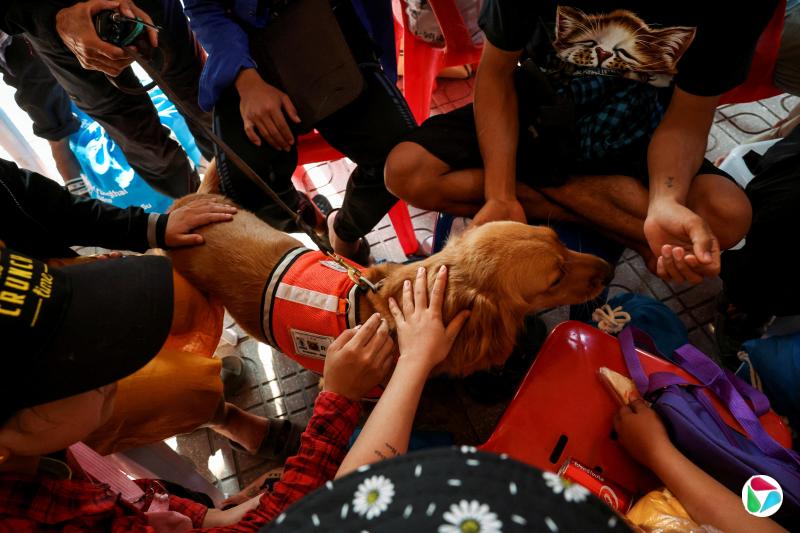 泰国的两只救援犬星期三(4月2日)短暂转换角色,为曼谷大楼倒塌事故中失踪人员的家属提供情感支持。