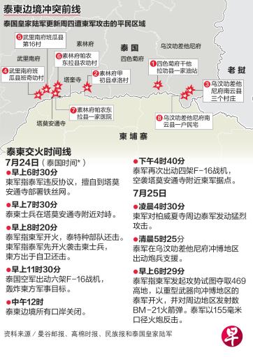 泰国军方指责柬埔寨以远程武器攻击泰国平民区,包括学校和医院;柬埔寨则指控泰国军方,使用大量集束弹药,违反人道准则。