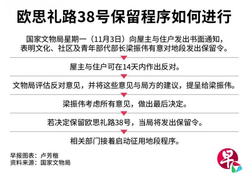 文物局已向欧思礼路38号的屋主和住户,发出意向通知书(Notice of Intention)。他们可在两周的期限内提出上诉,截止日期为11月17日。